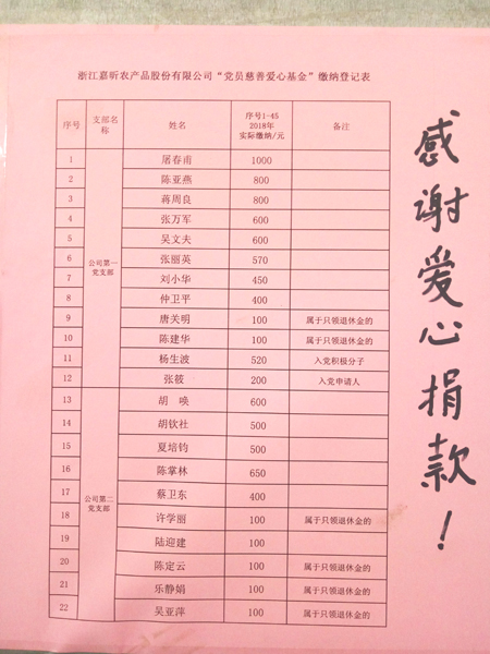 為繼續(xù)做好新一年度愛心基金工作,公司黨總支從2月5日-12日期間開展了2018年度公司“黨員慈善愛心基金”捐贈工作,得到了全體黨員、入黨積極分子、黨員經(jīng)營戶和入黨申請人的熱烈響應(yīng),黨總支屠書記率先獻愛心,共有45位同志踴躍捐款共計16890元,連同開發(fā)區(qū)下拔的結(jié)對困難戶慰問資金2160元,總計19050元匯入公司“黨員慈善愛心基金”池,開展2018年度向困難戶等扶弱濟困慰問工作。